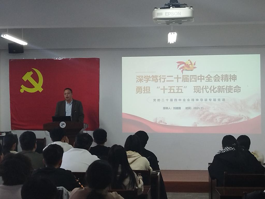 2025年11月17日,学院党委书记刘建国同志为学生党员和入党积极分子开展以"深学笃行二十届四中全会精神,勇担'十五五'现代化新使命"为主题的专题宣讲。