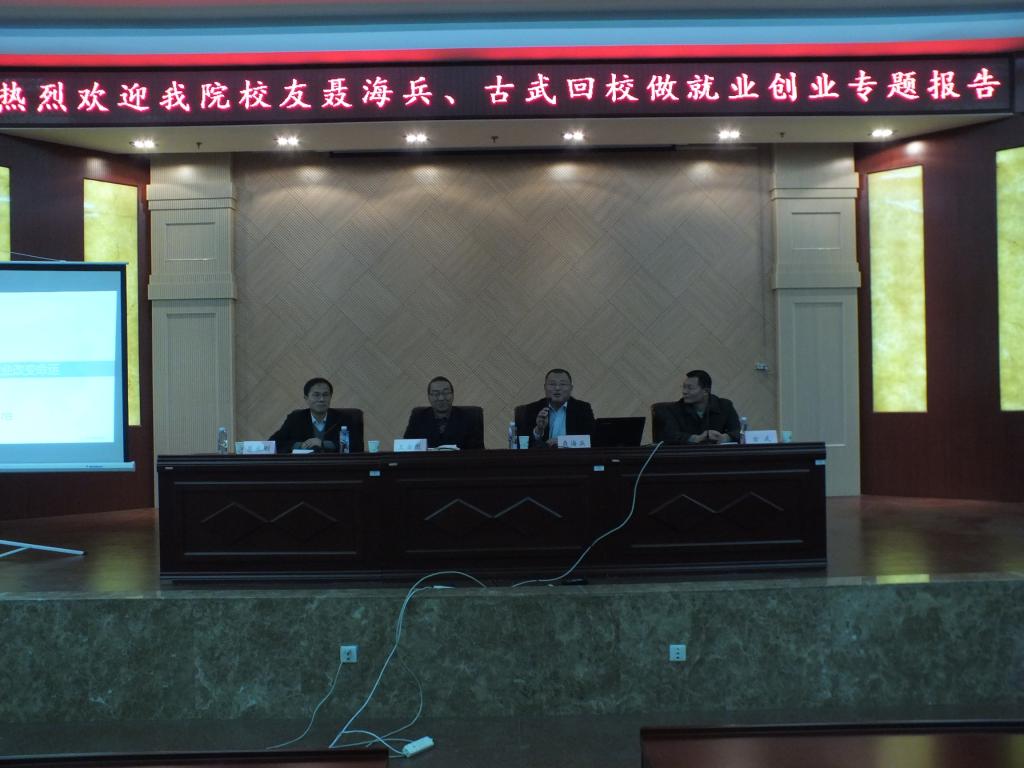 12月17日下午,我院邀请两位成功创业的校友回校为在校学生做就业、创业专题讲座。一位是我院95级计算机应用专业校友,北京赛孚信息技术有限公司、内蒙古赛孚信息技术有限公司、内蒙古博易智软技术有限公司三家公司的总经理聂海兵,另一位是我院96级电子工程专业校友,内蒙古大禹科技有限公司总经理古武。